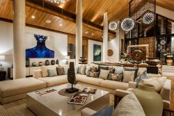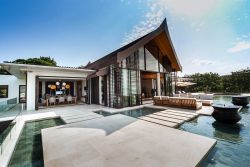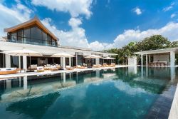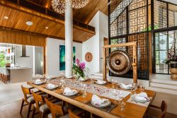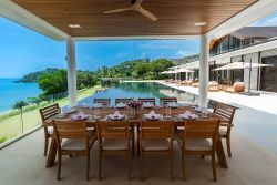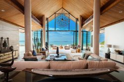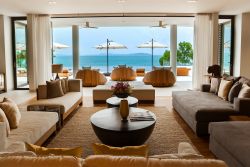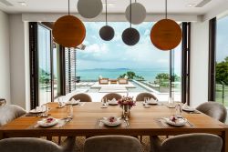 大厅内可以往外看到美丽的海景以及外面的休闲榻榻米,很宽敞。小餐厅是开放式环岛式的,可以选择在里面的8人桌上用餐,也可以去外面躺在休闲床上吃。无边泳池边上还有草坪,再往外就是大海了,很自然。别墅附近环境很好。房间内的风扇也很有感觉,是木质的扇叶,很时尚。