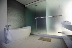 throoms with rain shower and bathtub with a view.The pool is big enough and very photogenic.